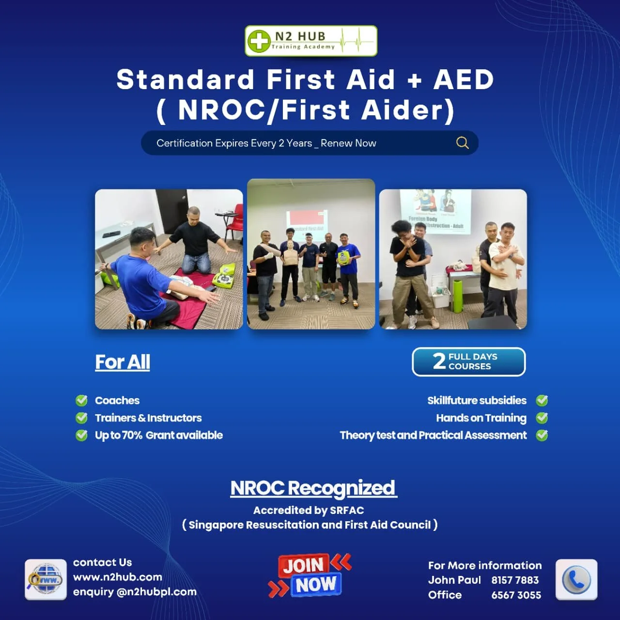 This course is aimed to equip Security Officers with proper knowledge on rendering first aid to the member of public during their course of duty. They will also be certified to perform CPR and carry out the usage of AED during cardiac arrest situation.